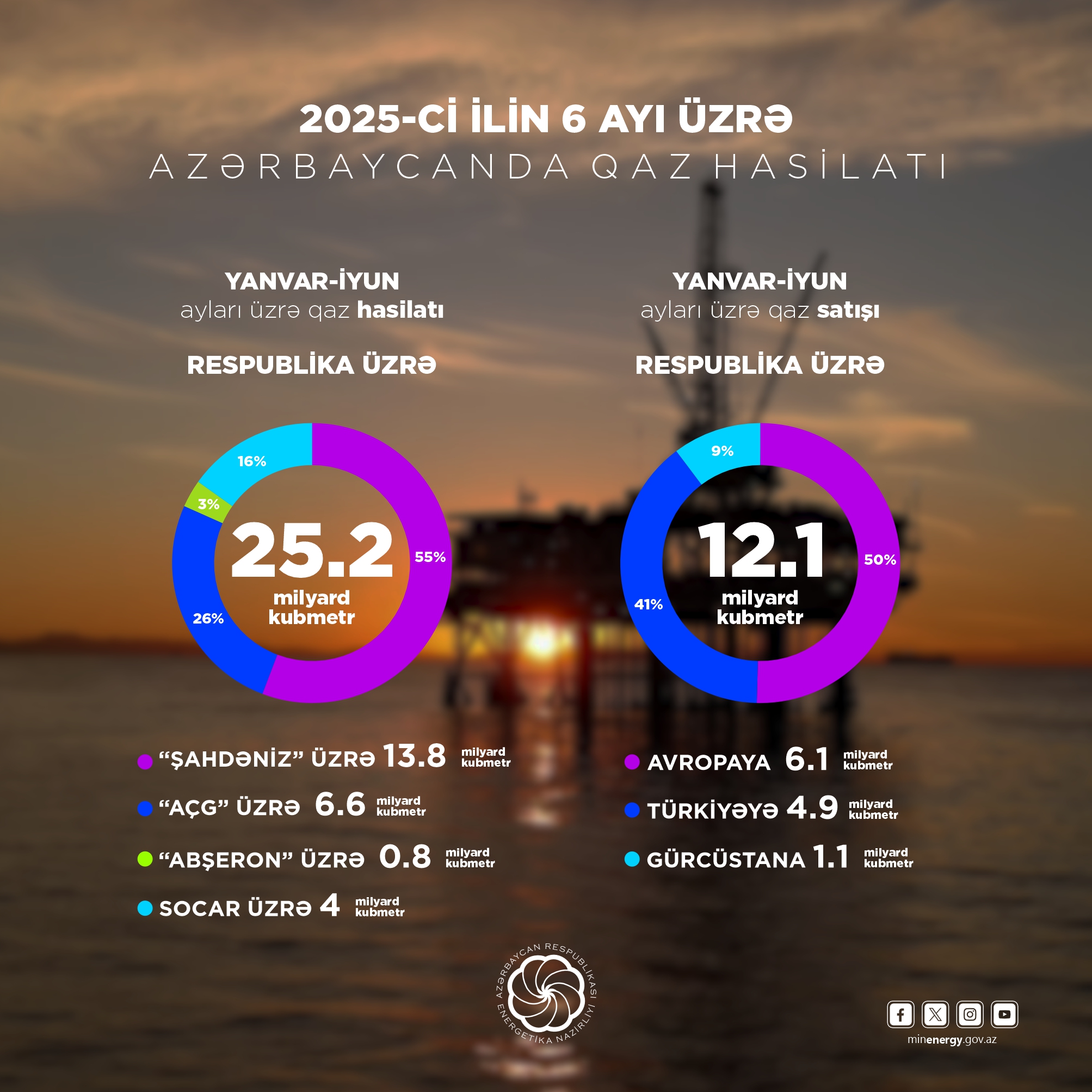 2025-ci ilin yanvar-iyun aylarında ölkədə 25,2 milyard kubmetr təbii qaz hasil edilib. Qazın 6,6 milyard kubmetri “Azəri-Çıraq-Günəşli”nin, 13,8 milyard kubmetri “Şahdəniz”in, 0,8 milyard kubmetri “Abşeron” yatağının, 4 milyard kubmetrə yaxını isə SOCAR-ın payına düşüb.
